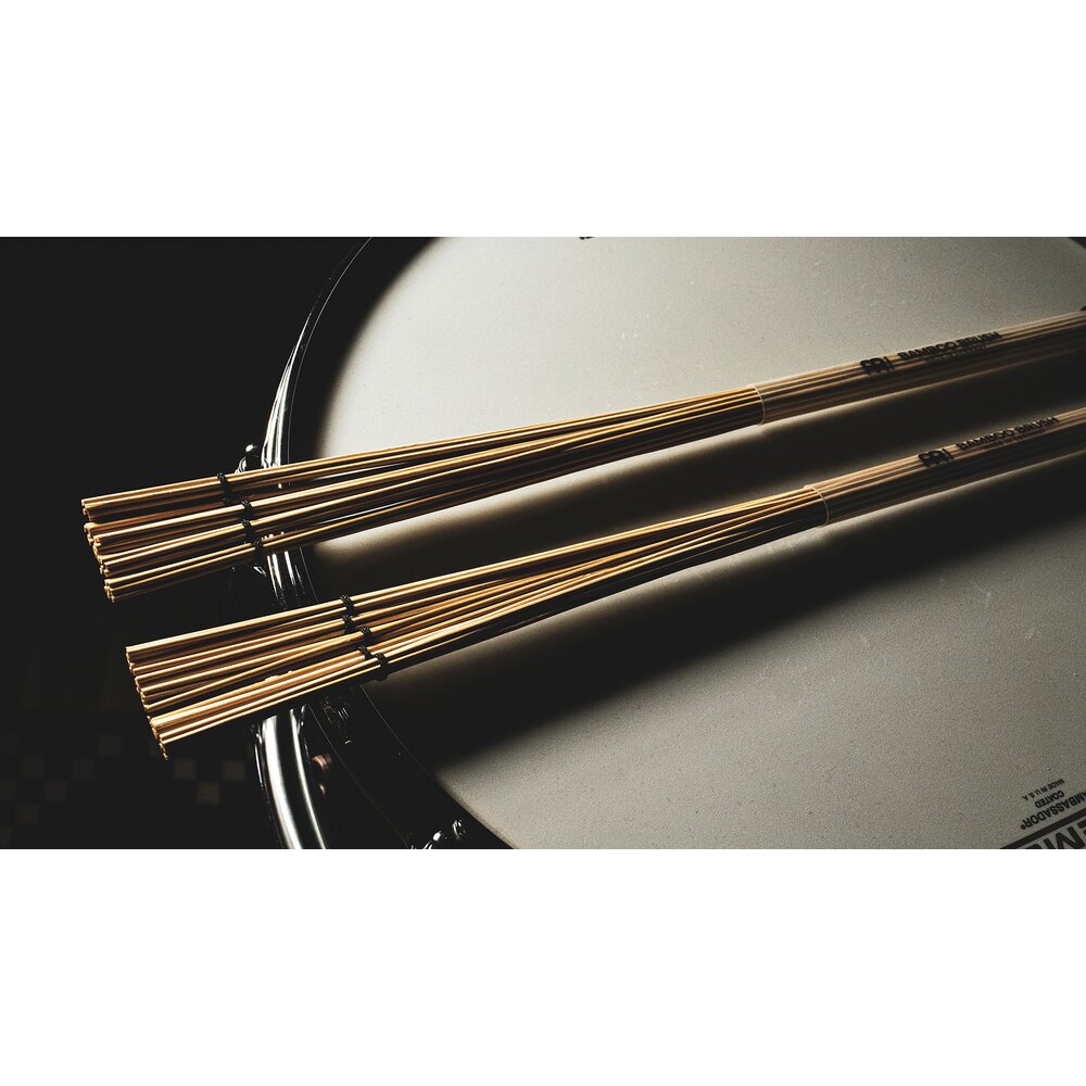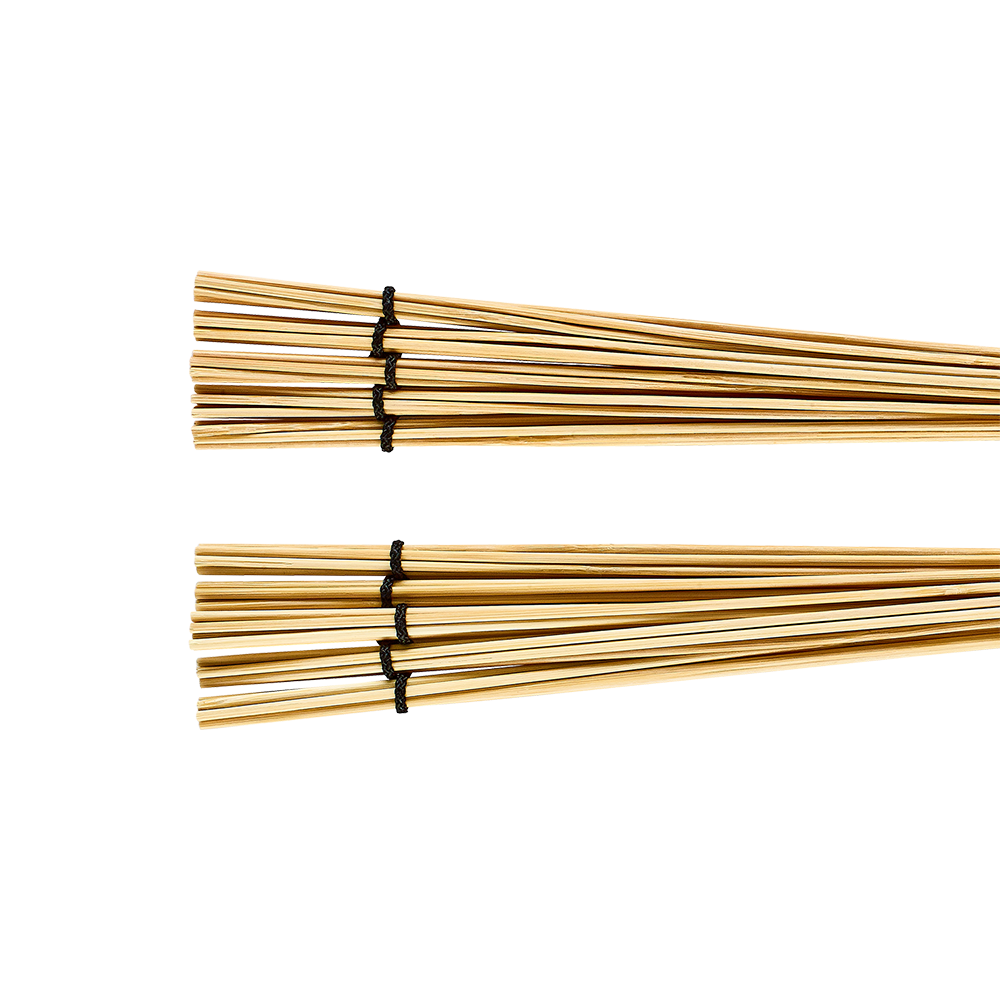 By using bamboo dowels in place of wires, we have created a unique type of brush. Drummers can use the fan shape in sweeping patterns or get a full and fat backbeat from their snare drum, and percussionists can use them on all types of instruments and effects.